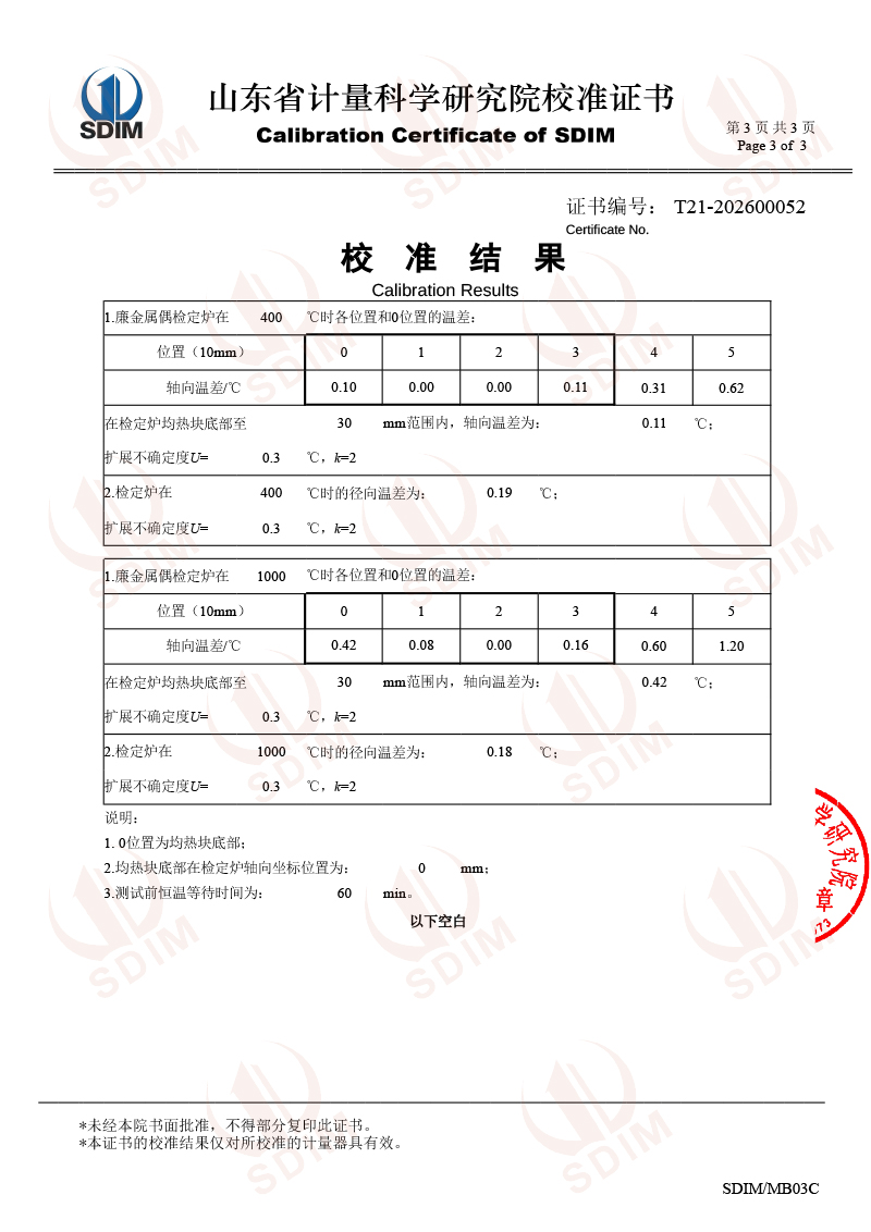 廉金属热电偶检定炉-校准证书