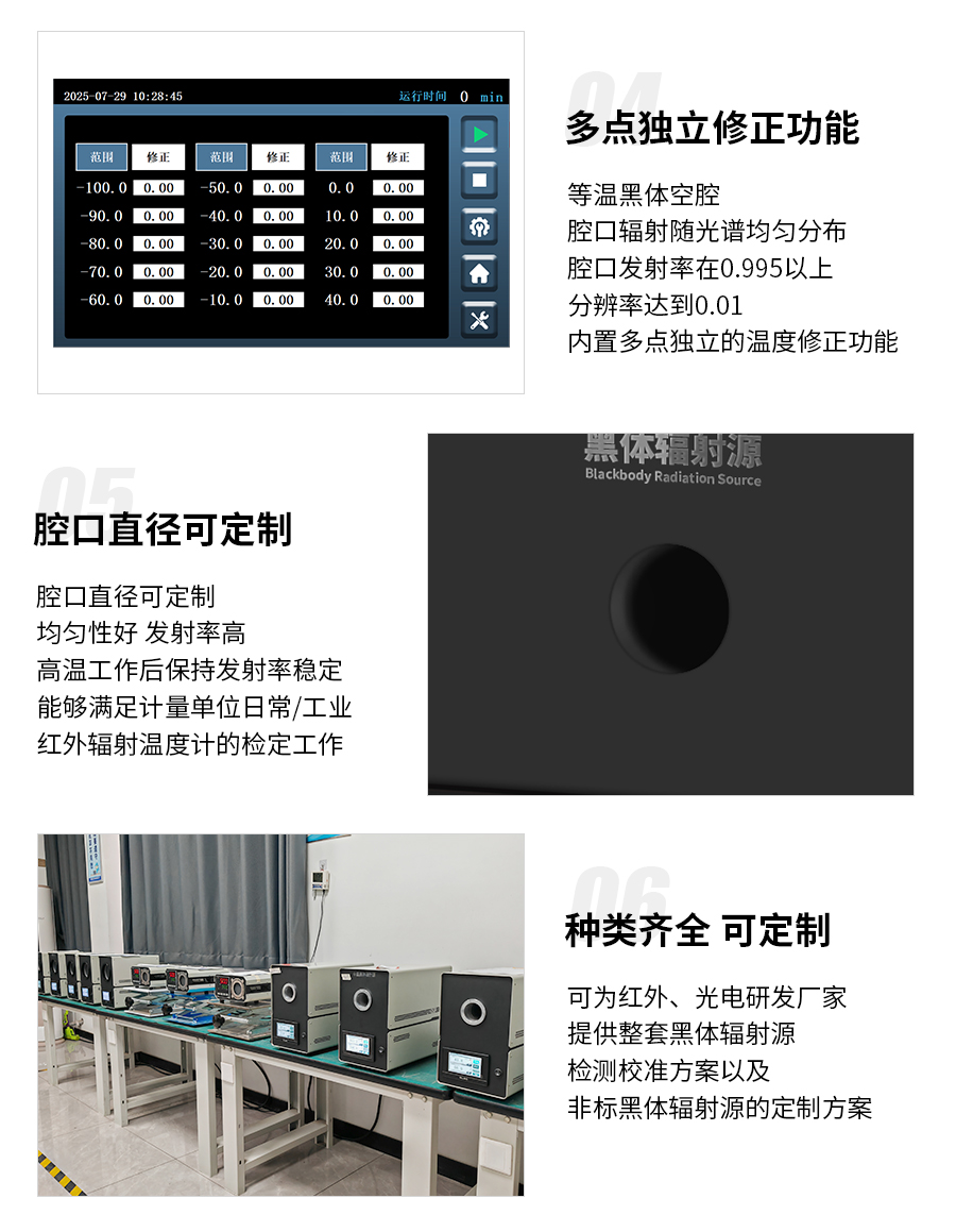 5)等温黑体空腔,只一个腔口,腔口辐射随光谱均匀分布,腔口发射率在0.995以上,分辨率达到0.01;